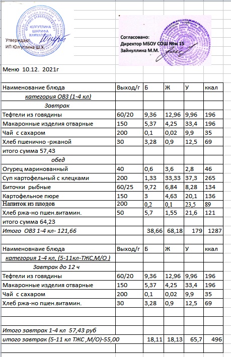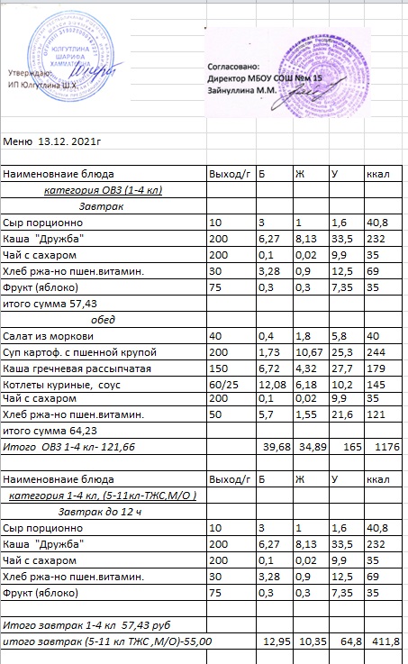 (Меню 1-4 класс, ОВЗ)