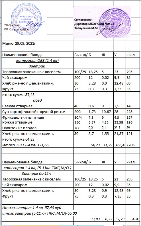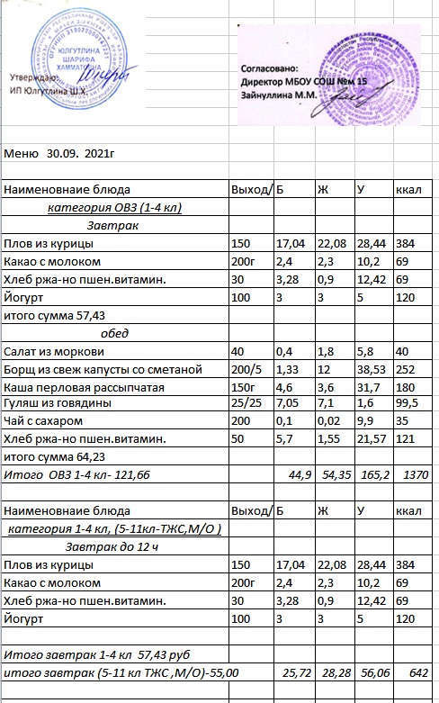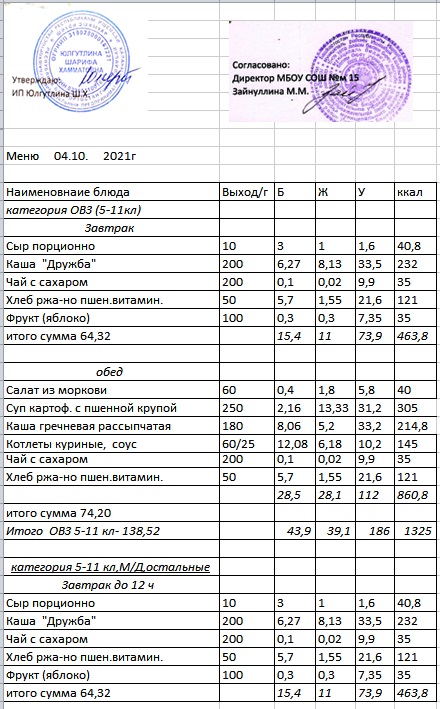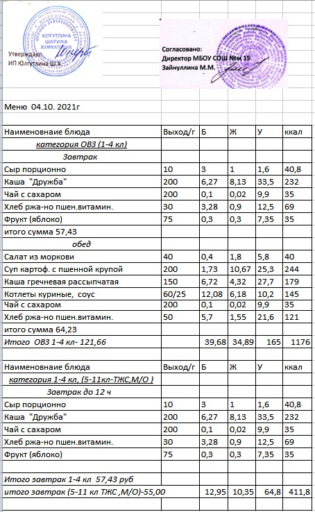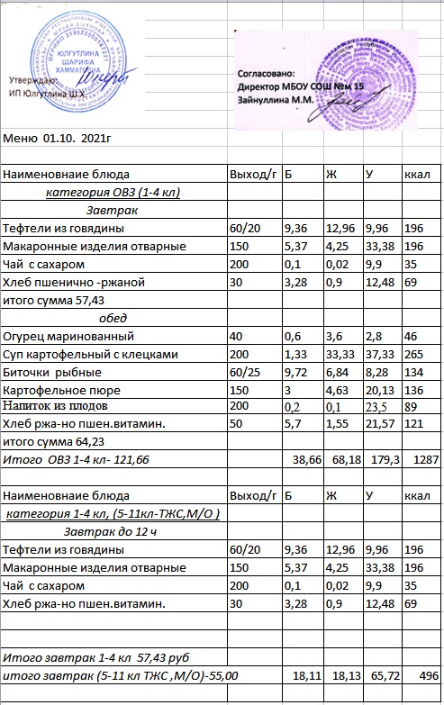 (Меню 1-4 класс, ОВЗ)